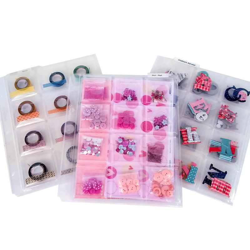 Storage pages with pockets are a great way to keep your embellishments visible and accessible. Consider using the following storage pages, and then storing them on a ScrapRack base or in a Spinder Binder.