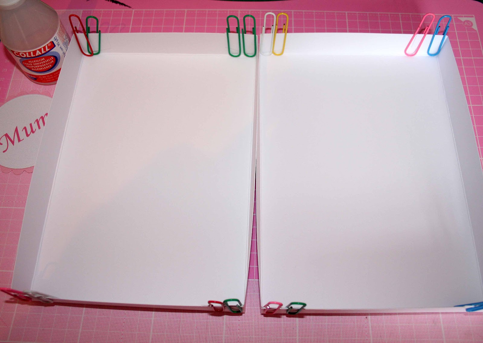 Then I created a box for it (again using the Centura Pearl). Now it's really important when you are creating a box to always use a wet glue to stick the edges - Leann's 'Best Glue in the World' (aka Collall All Purpose Glue) I find works an absolute treat! It's wet but doesn't warp the paper, and it dries relatively quickly. I didn't have any of my new purple paperclips to hand so I used some old ones fromt he drawer!!!