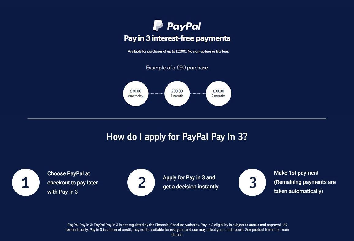 PayPal Pay in 3 is an interest-free loan that lets you split your basket into 3 payments, with the first due at time of purchase and subsequent payments due every month on the same date. It’s a great way to spread the cost of larger items or to cover emergencies, and is a helpful tool to manage your budget more effectively. Pay in 3 is an unregulated credit agreement, so you will have fewer protections under this agreement than you would under a regulated credit agreement. Carefully consider whether the purchase is affordable and how you will make the repayments. Be aware of the possible impact of using Pay in 3 and of missing payments, including making other borrowing more difficult or more expensive.