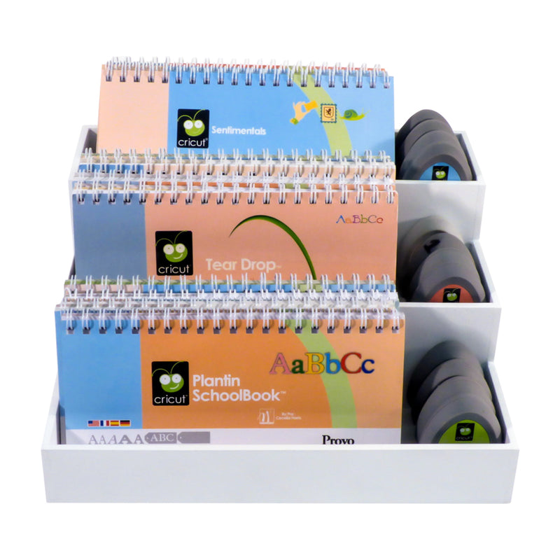 The Desk Maid Stadium Arranger will hold 12 Cricut Cartridges, Booklets and Overlays.