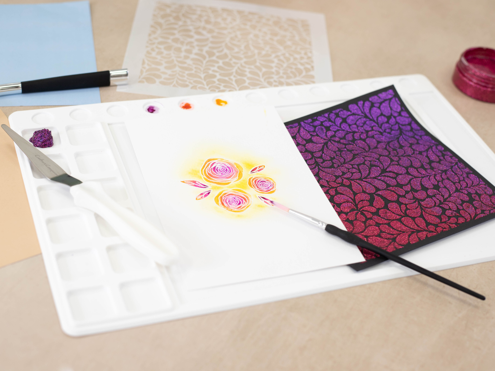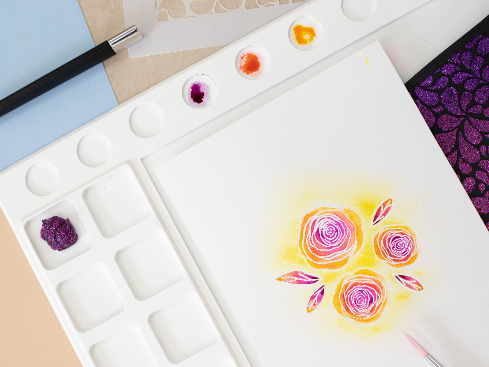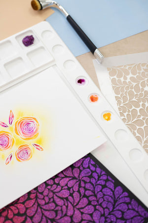 - Perfect for working with watercolour, blended inks, glitter paste and more.