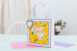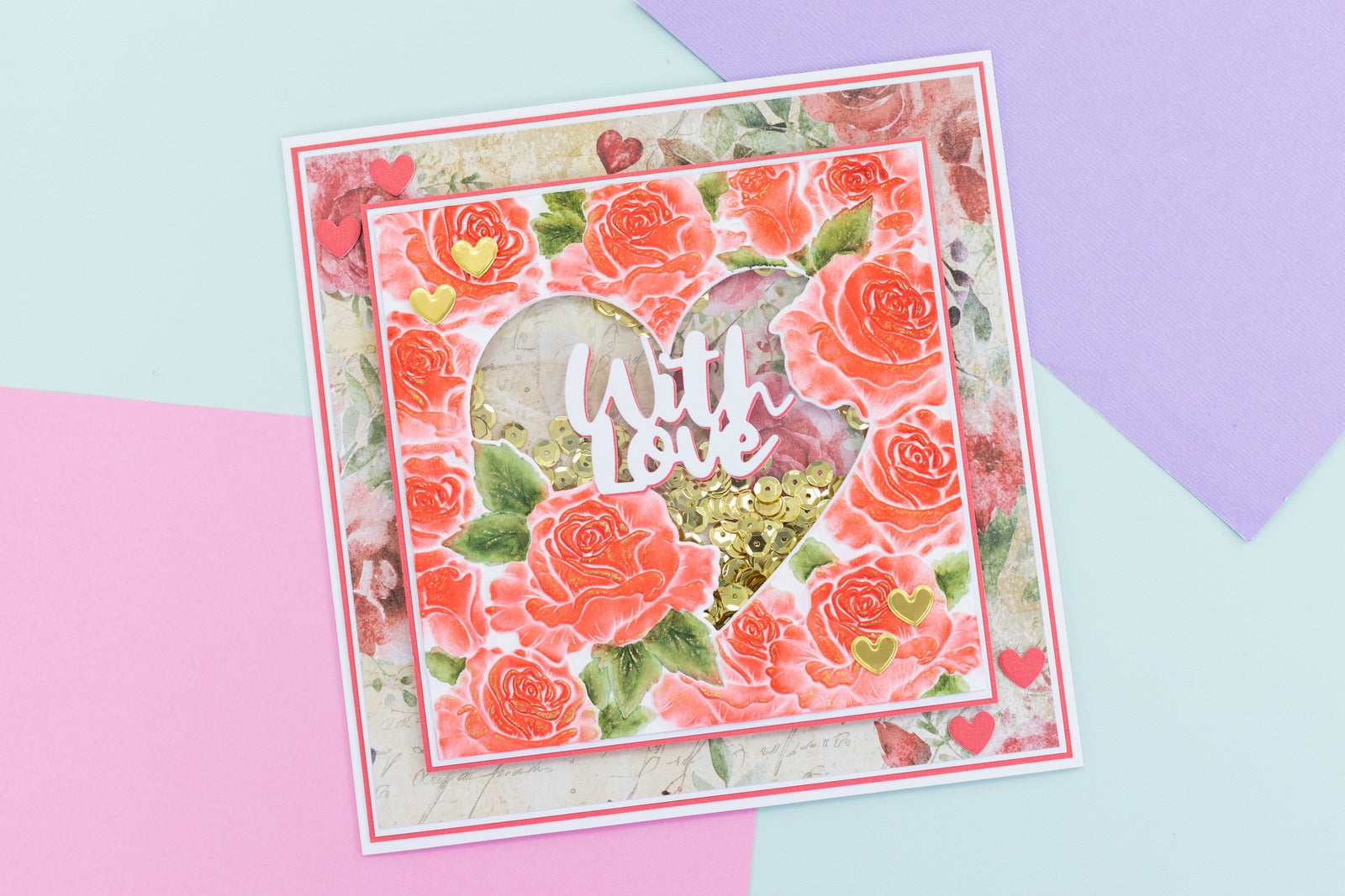 Create romantic crafts and projects with the Radiant Rose 3D Embossing Folder, Metal Die and Stencil Set from Crafter’s Companion. This set includes an embossing folder, a template, and a metal die to create a gorgeous frame for a handmade greeting card of a heart surrounded by roses.