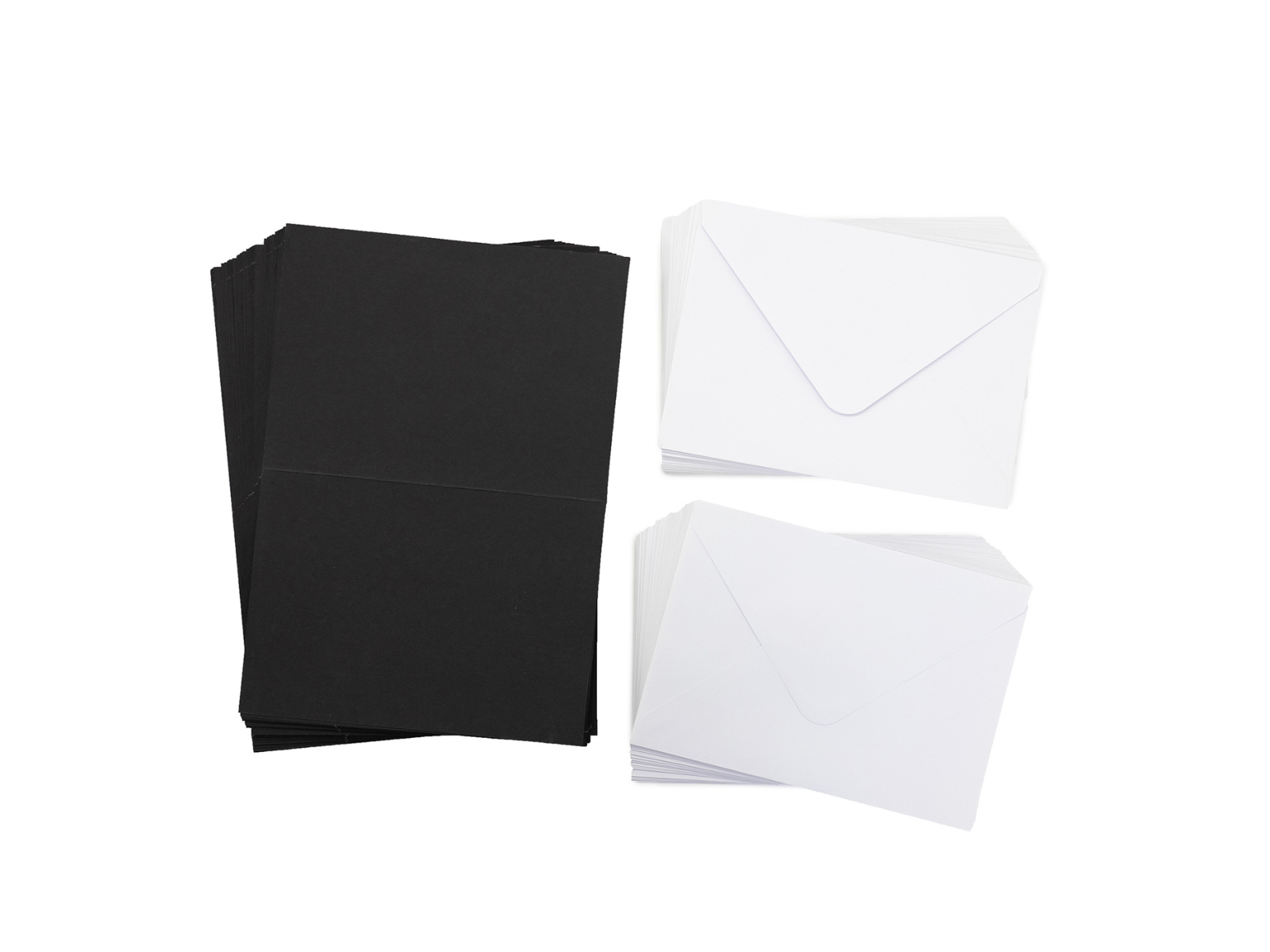 Chic and stylish - The Crafter’s Companion 5” x 7” Black Card & White Envelopes 100pc set includes 50 black, pre-scored card blanks and 50 white envelopes. Craft elegant and atmospheric cards to match your next special event or big celebration.