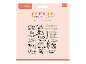 Share words of wisdom and inspiration to friends, family, and loves ones with the You Did it! Clear Acrylic Stamp set from the Crafter’s Companion Celebrate Good Times collection. This set features 21 stamps with positive sentiments and several occasions, ideal for your next handmade card, gift bag, scrapbook page, and more.