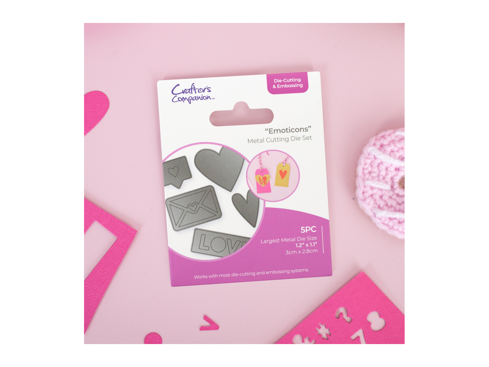 The Emoticons Mini Die Se includes 5 dies with a romantic theme, including love hearts, a love speech bubble, an envelope sealed with a heart and a ‘Love’ sentiment. This set is perfect for creating stylish cards for Anniversaries, Valentine’s day, weddings and more.