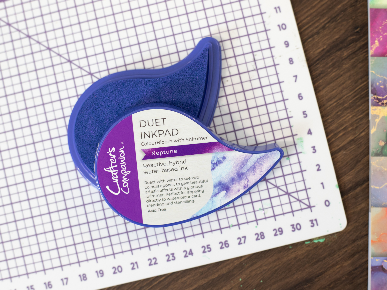 - Innovative inkpad that reveals two colours with added shimmer when applied with water.