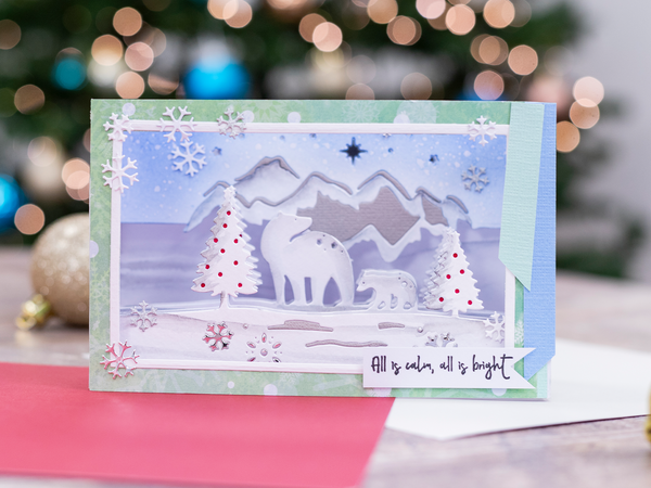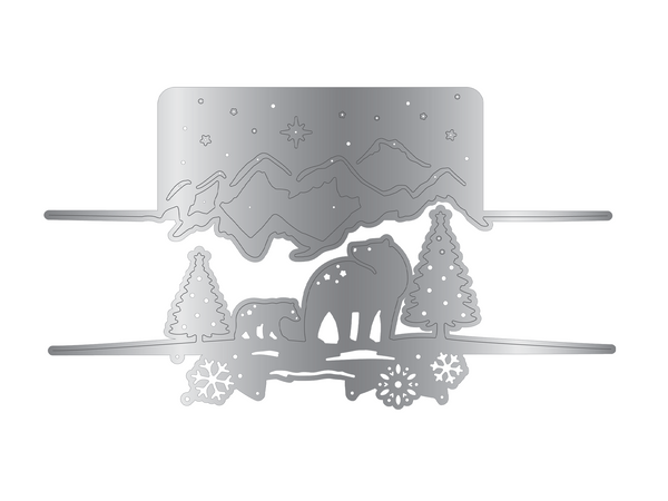 - Includes two metal dies to create the scene of two polar bears set against mountains, fir trees, and snow.