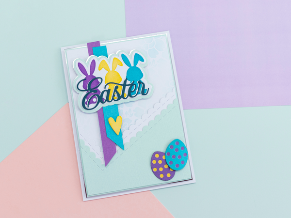 - Includes six metal dies that layer to create an image of three bunnies and the word easter in a cursive font.