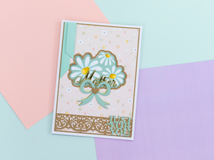 - Includes six metal dies that layer to create an image of three flowers and the word mother in a cursive font.