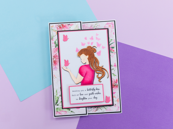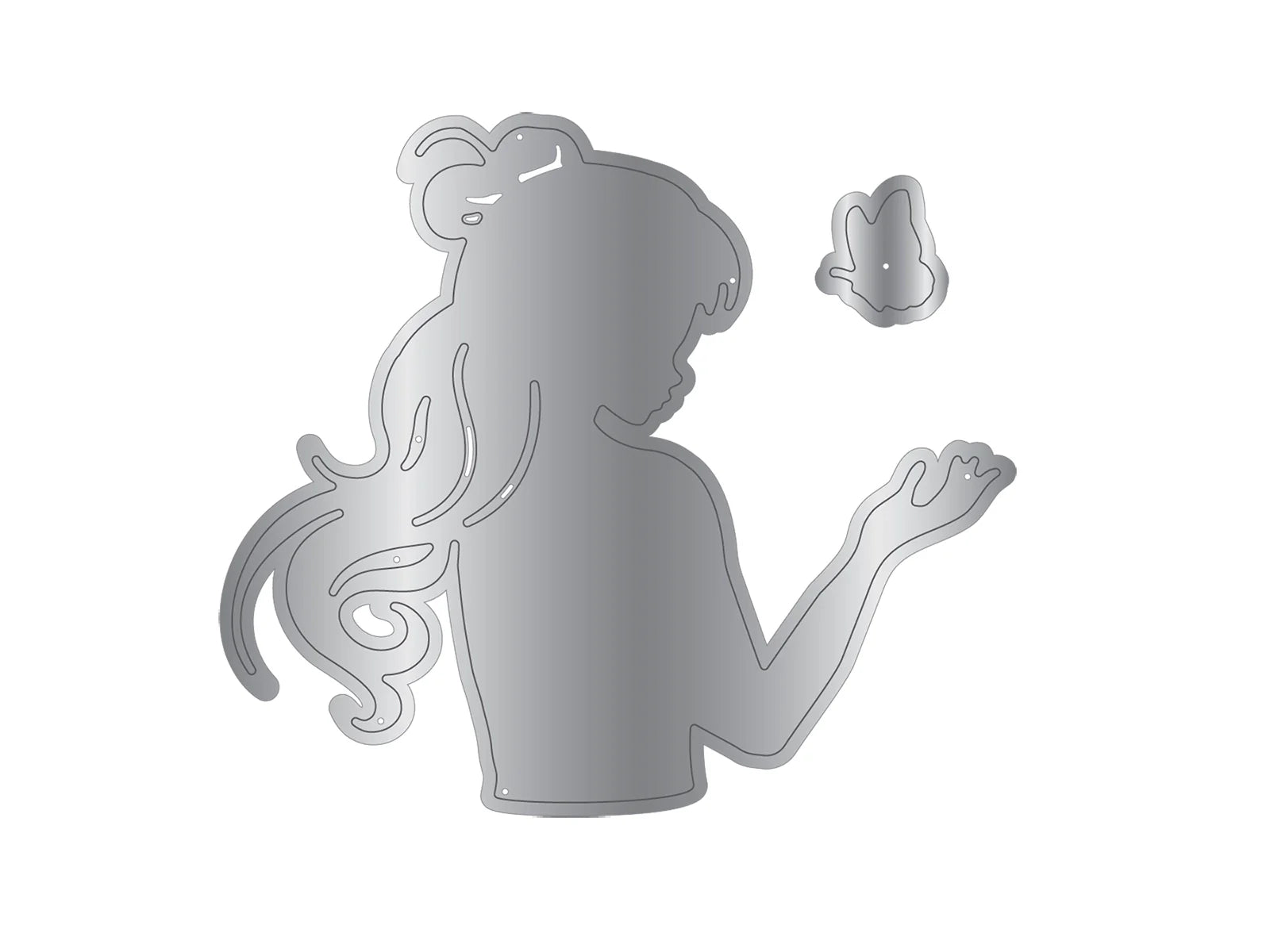 Bring a flutter of the natural to your crafts and projects with the Butterfly Kisses Metal Die, Stamp & Stencil Set by Crafter’s Companion. This set creates a gorgeous image of a girl surrounded by butterflies, ideal for a whimsical handmade greeting card, scrapbook page, and more.