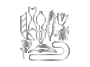 - 10-piece metal die set of classic Christmas images of candy canes and foliage.