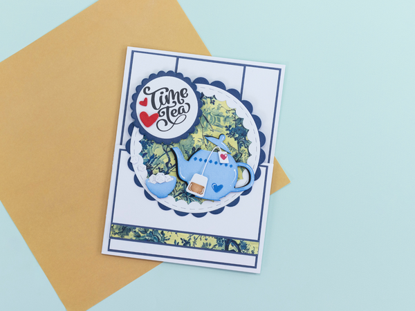 - 7-piece metal die set to cut images of teapots, teacups, teabags, and more.