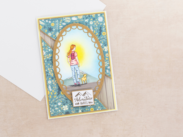 Take your crafts and projects down the Scenic Route with this Clear Acrylic Stamp Set from The Great Outdoors collection by Crafter’s Companion. This acrylic stamp of a woman and her dog embarking on a journey is the perfect addition to your next handmade papercraft from cards to scrapbook pages and much more.
