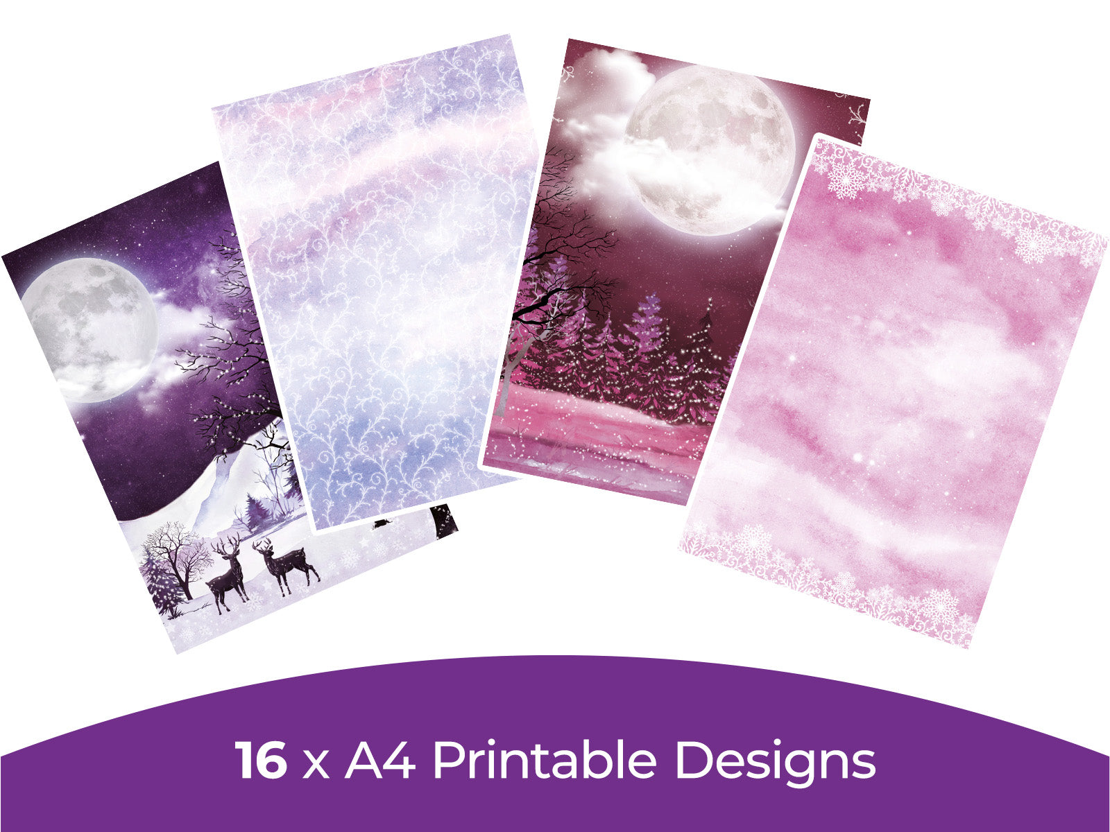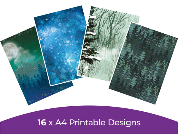 The Enchanted Christmas Digital Paper Pad brings a unique take on the festive season to your crafts and projects with striking silhouettes of forests and deers set against a towering moon. With stunning electric blues, greens, pinks, and purples, this pad is perfect for making different handmade Christmas cards, decorations, and more.