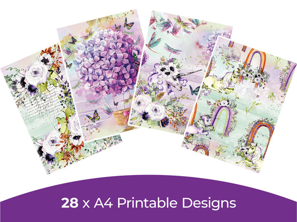 The Enchanted Dreams Digital Paper Pad is filled with dreamy floral patterns, sweet dragonflies, gorgeous garlands, unicorns, and fantastical hot air balloons. With a misty palette of sweet lilac, blush pink, pale jade and gold - it’s the perfect way to add some romance to your fairytale papercrafts.