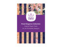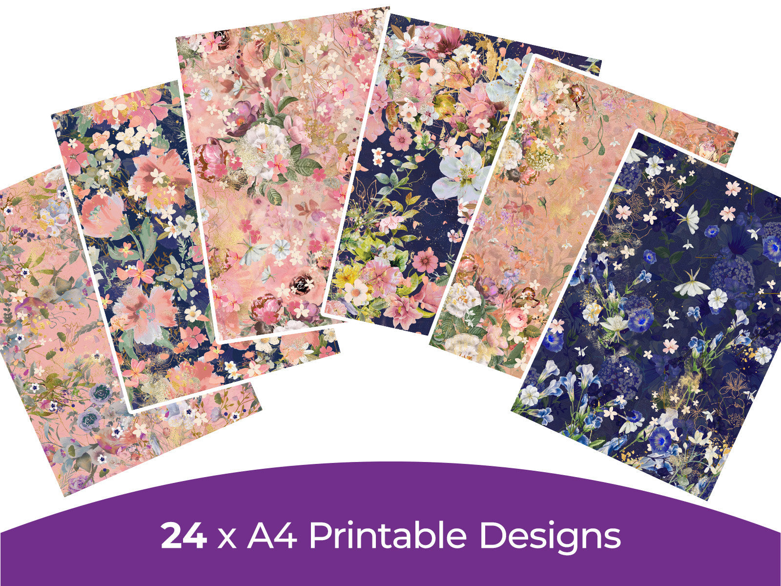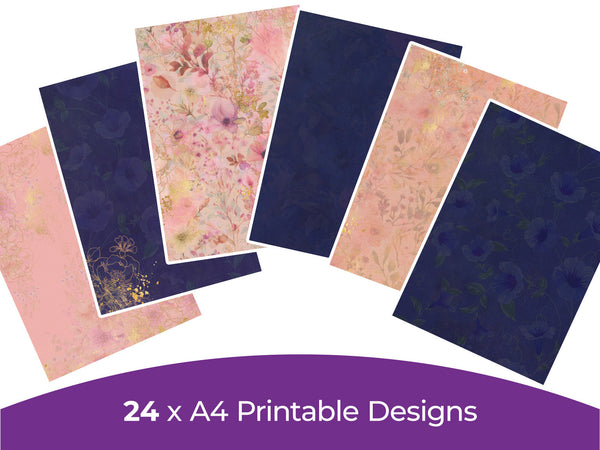 The Floral Elegance Digital Paper Pad features 24 designs, each blooming with elegant peonies, rich roses, wildflowers, and tiny delicate blossoms. Blush pink and rich, midnight blue combine to create a timeless look that suits every season.