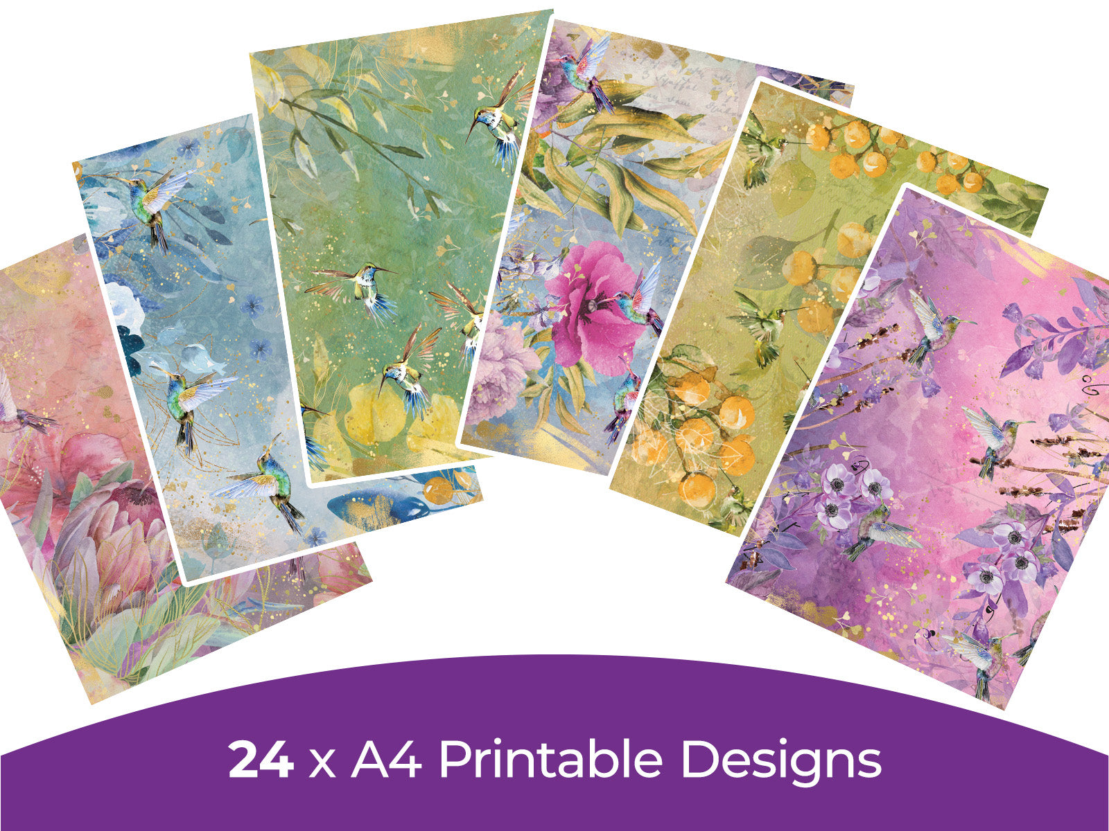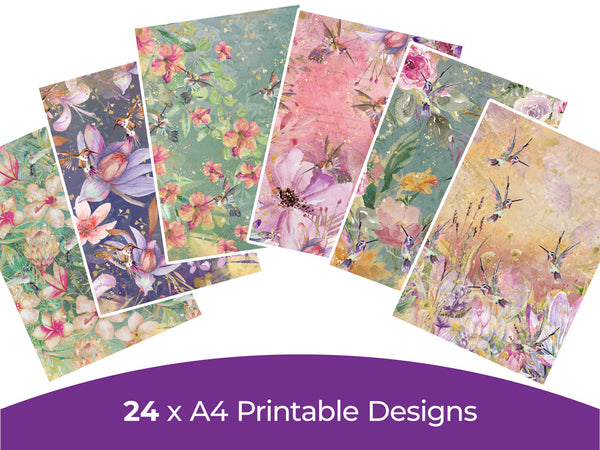 The Hummingbird Digital Paper Pad is truly gorgeous. This download features 24 designs filled with lush florals, airy watercolour backgrounds, and exquisite hummingbird illustrations. A palette of fuchsia, indigo, emerald, and jade is highlighted with soft brush strokes of metallic gold to create a radiant effect.