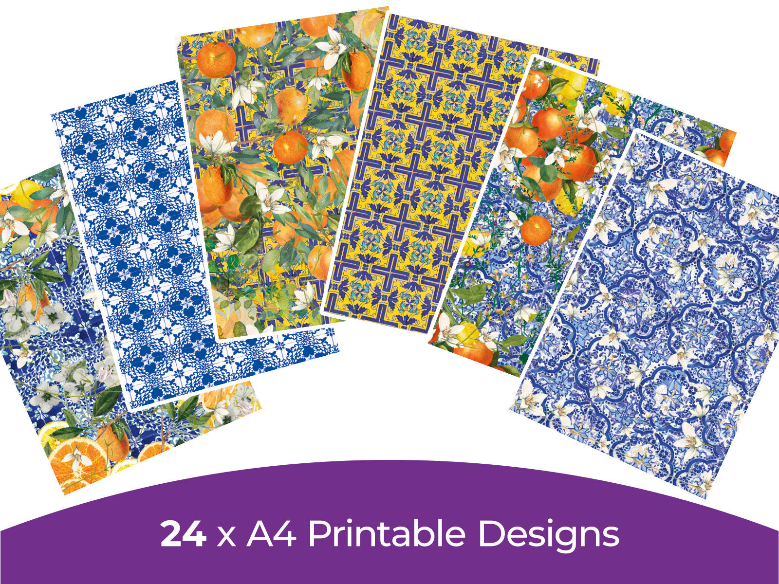 The Mediterranean Digital Paper Pad includes 24 designs featuring sundrenched illustrations of citrus vines, heritage tile patterns, and delicate blossoms. A radiant palette of fresh white and porcelain blue is lifted by pops of zesty yellow and orange to bring the sunshine to your papercraft makes, no matter the season!