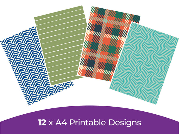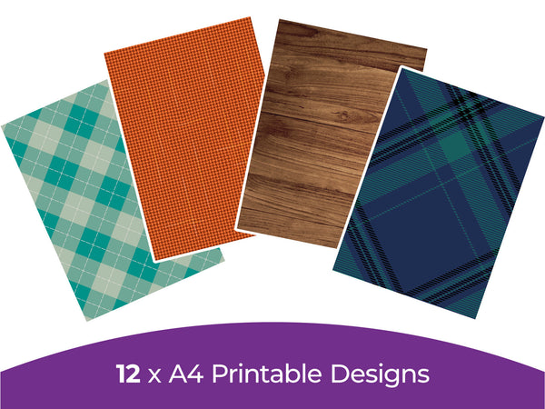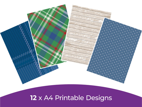 The Modern Man Digital Paper Pad includes 12 designs with a range of timeless striped, plaid, and spotted patterns alongside realistic wood designs. Rich blues, greens, rust, and natural tones create a classic, masculine feel.