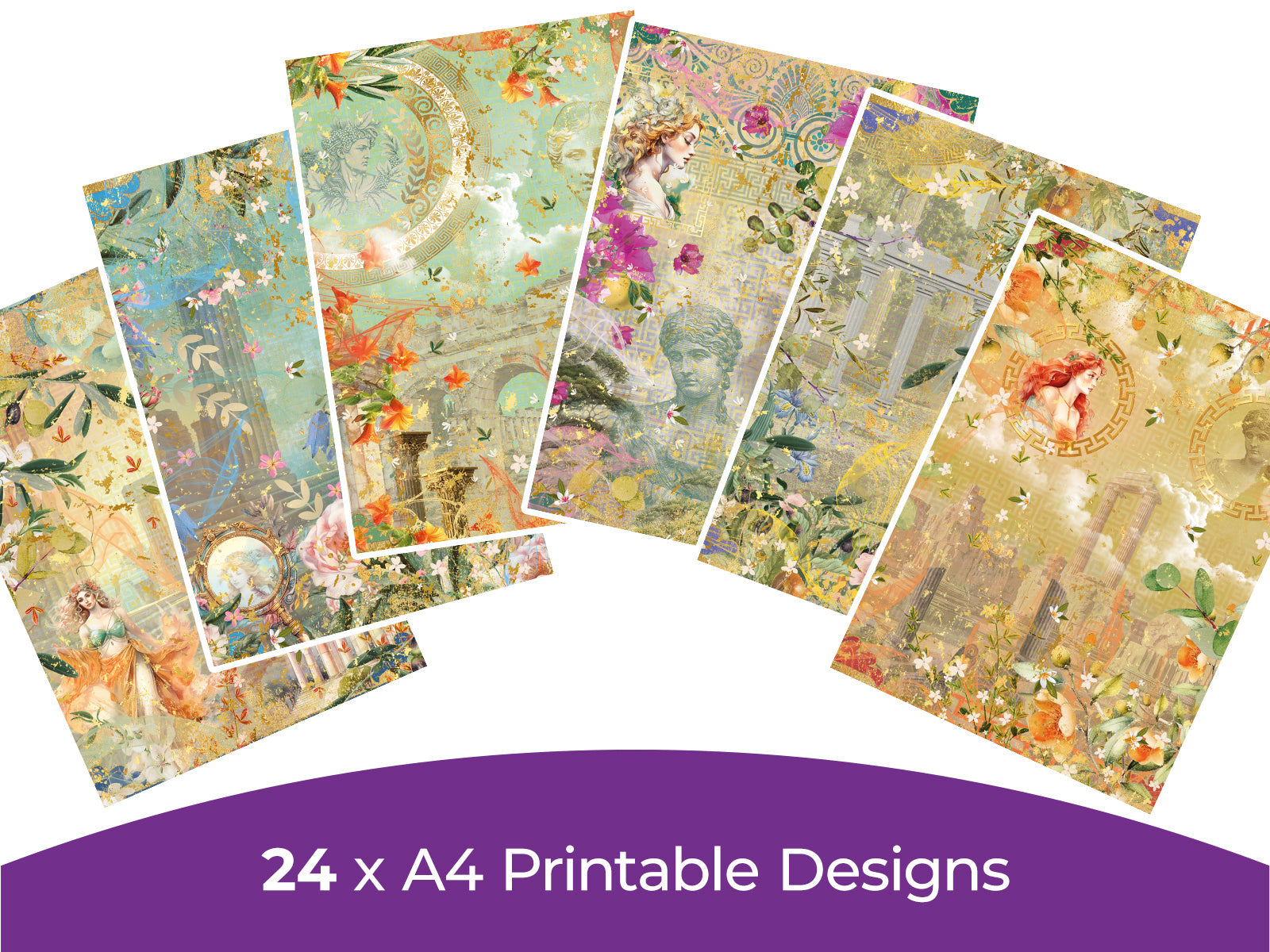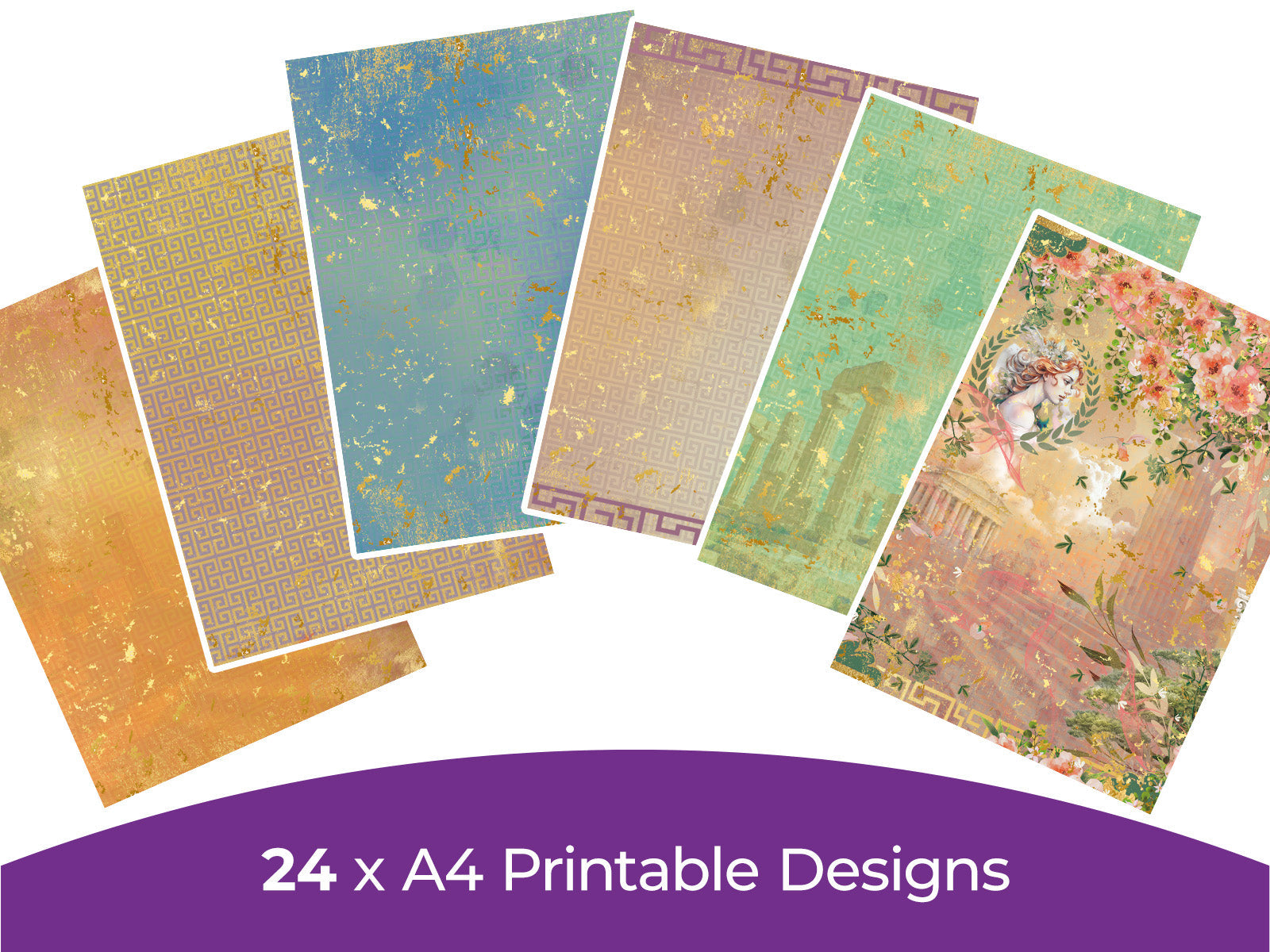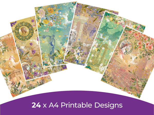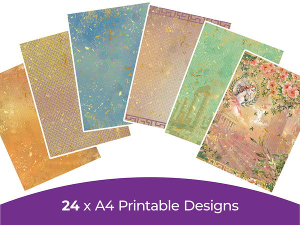 Travel in time to the grandeur and enchantment of ancient Greece with the Myths and Legends Digital Paper Pad, a gateway to timeless magic for every papercraft project. Download includes 24 designs decorated with mythological scenes, graceful colonnades, sacred temples, and iconic olive branches.