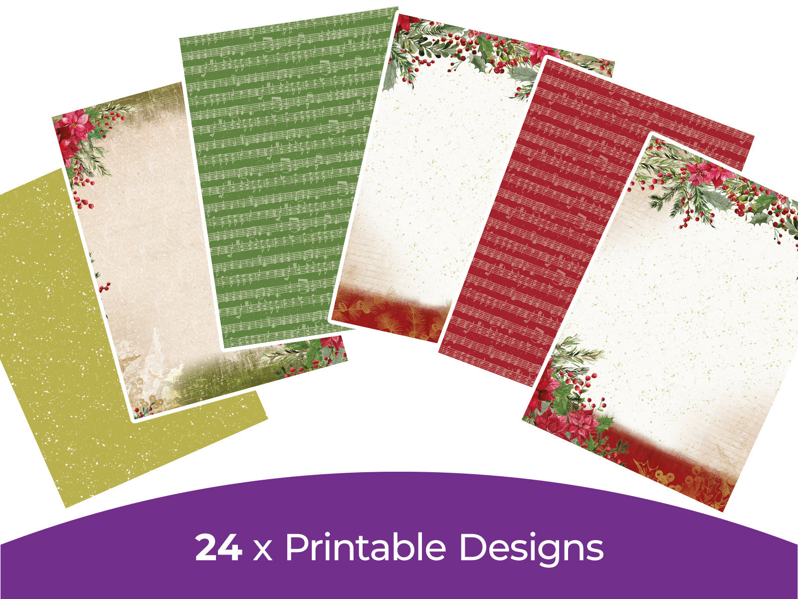 - 24 designs featuring classic red poinsettias, festive foliage, and crimson berries with bold florals, repeat patterns and elegant borders.