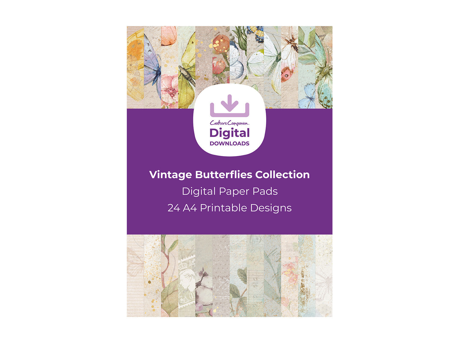 Take your next crafty creation to the next level with the Crafter’s Companion Vintage Butterflies Digital Paper Pad. This stylishly beautiful collection is perfect for a variety of occasions and features everything from butterflies to flowers and various blocks of text surrounded by vintage tones.