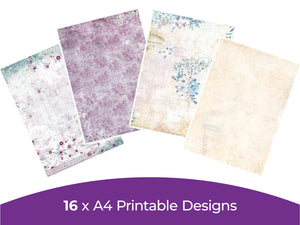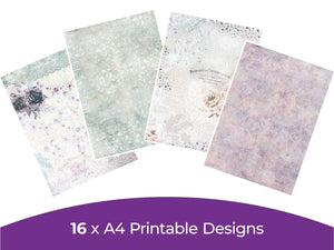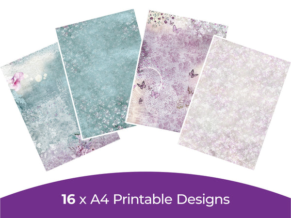 Add a touch of elegance and grace to your crafts and projects with the Vintage Lace Digital Paper Pad. This downloadable pad includes 16 designs inspired by vintage looks with soft, faded purples, blues, greens, and whites adorned with florals, perfect for bringing vintage class to your craftrooms.