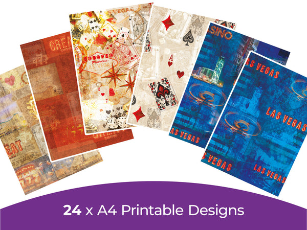 Create fun invitations, stylish cards, and dazzling décor with all the glitz and glamour of Vintage Vegas Digital Paper Pad. This download features 24 designs of classic Las Vegas scenes, including the iconic skyline, the bright lights of The Strip, the fun of the casino, and vintage US flags.